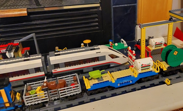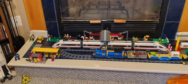 | Here's a pic of some of our train sets -- Train Station (60050-1), High-Speed Passenger Train (60051-1), and Cargo Train (60052-1). Plus some of our LEGO City stuff. (Extra tracks and the other mini-station for for the passenger train not pictured.)