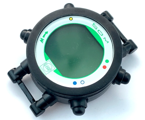 Watch Part, Case Digital - Black Buttons, White Face, Green Brick 1 x 1 and '50M', Colored Dots