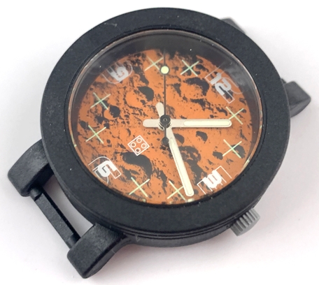 Watch Part, Case Analog - Brick 2 x 2 and Craters, Silver Hour and Minute Hands with Glow in the Dark Areas, Black Second Hand with Glow in the Dark Area