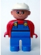 Duplo Figure, Male, Blue Legs, Red Top with Blue Overalls, Construction Hat White, Turned Up Nose
