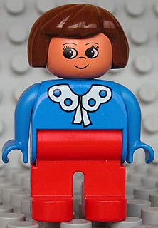 Duplo Figure - Female, Adult Woman, Red Legs, Blue Top with Lace Collar Pattern, Brown Hair, Nougat Head (75472)