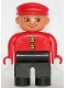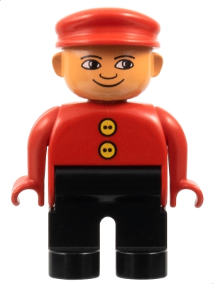 Duplo Figure, Male, Black Legs, Red Top with 2 Yellow Buttons, Red Cap