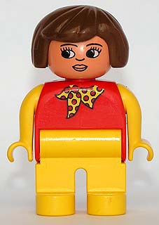 Duplo Figure, Female, Yellow Legs, Red Top with Yellow Polka Dot Scarf, Yellow Arms, Brown Hair, Nose and Lips, White in Eyes