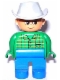 Duplo Figure, Male, Blue Legs, Green Top with Pocket, Light Gray Cowboy Hat
