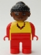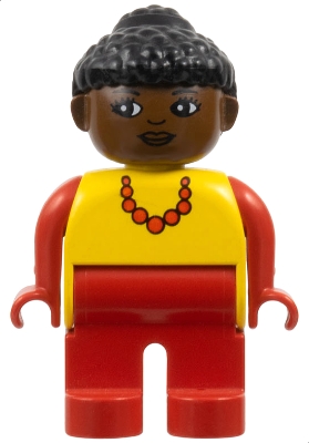 Duplo Figure, Female, Red Legs, Yellow Top with Red Necklace, Black Curly Hair in Bun, Brown Head