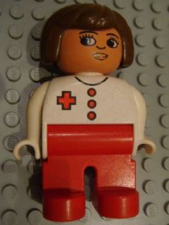 Duplo Figure, Female Medic, Red Legs, White Top, Brown Hair, Red Cross