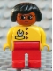 Duplo Figure - Female, Adult Woman, Red Legs, Yellow Top with Buttons and Wrench in Pocket Pattern, Black Hair, Dark Orange Head (75510)