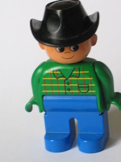 Duplo Figure, Male, Blue Legs, Green Top with Pocket, Black Cowboy Hat