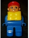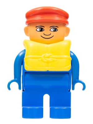 Duplo Figure, Male, Blue Legs, Blue Top, Life Jacket, Red Cap, with White in Eyes pattern