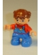 Duplo Figure Lego Ville, Child Girl, Blue Legs Overalls with Yellow Flower in Pocket, Red Top, Reddish Brown Hair, Brown Eyes