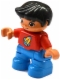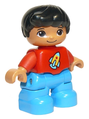 Duplo Figure Lego Ville, Child Boy, Dark Azure Legs, Red Top with Space Rocket Ship, Black Hair (6136449 / 6233698)