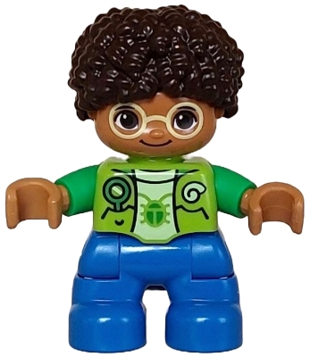 Duplo Figure Lego Ville, Child Boy, Blue Legs, Lime Vest, Yellowish Green Shirt, Bright Light Yellow Glasses, Dark Brown Hair (6446049)