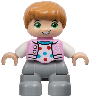 Duplo Figure Lego Ville, Child Boy, Light Bluish Gray Legs, Bright Pink Jacket with Capital Letter C, Polka Dot Shirt, Medium Nougat Hair (6446171)