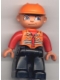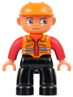 Duplo Figure Lego Ville, Male, Black Legs, Orange Vest, Orange Construction Helmet