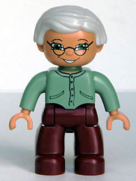 Duplo Figure Lego Ville, Female, Dark Red Legs, Sand Green Sweater, Very Light Gray Hair, Green Eyes, Glasses