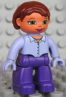 Duplo Figure Lego Ville, Female, Dark Purple Legs, Light Lilac Button Top with Necklace, Light Lilac Hands, Reddish Brown Hair, Green Eyes