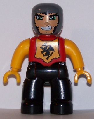 Duplo Figure Lego Ville, Male Castle, Black Legs, Red Chest with Dragon Emblem, Bright Light Orange Arms and Hands, Lefty Smile