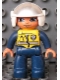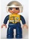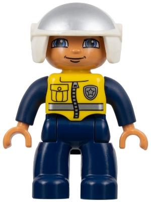 Duplo Figure Lego Ville, Male Police, Dark Blue Legs and Jumpsuit with Yellow Vest, White Helmet