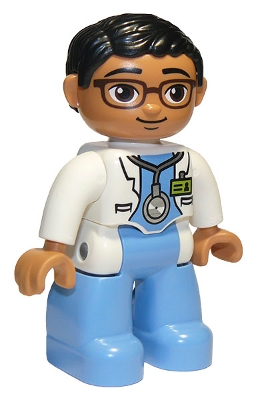 Duplo Figure Lego Ville, Male Medic, Medium Blue Legs, White Lab Coat, Stethoscope, Glasses, Black Hair, Oval Eyes