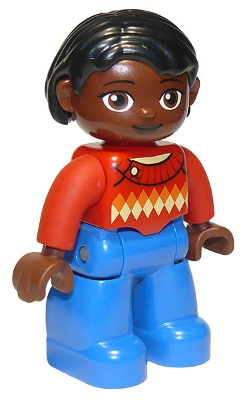 Duplo Figure Lego Ville, Female, Blue Legs, Red Argyle Sweater, Red Arms, Brown Head, Black Hair, Oval Eyes