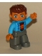 Duplo Figure Lego Ville, Male, Dark Bluish Gray Legs, Dark Azure Jacket, Black Shirt, Reddish Brown Hair