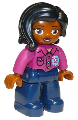 Duplo Figure Lego Ville, Female, Dark Blue Legs, Magenta Shirt with Flower, Black Hair (6296662)