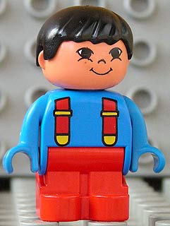 Duplo Figure, Child Type 1 Boy, Red Legs, Blue Top with Red Suspenders, Black Hair