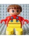 Duplo Figure, Child Type 2 Girl, Yellow Legs, Red Top with Yellow Overalls and Hearts on Straps