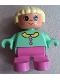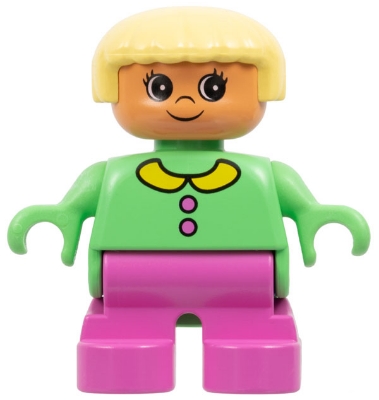 Duplo Figure - Female, Child Girl, Dark Pink Legs, Medium Green Top with Collar and Buttons Pattern, Light Yellow Hair, Nougat Head (75463)