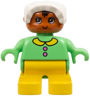 Duplo Figure - Female, Child Baby, Yellow Legs, Medium Green Top with Collar and Buttons Pattern, White Bonnet, Dark Orange Head (75514)