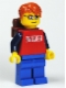 Red Shirt with 3 Silver Logos, Dark Blue Arms, Blue Legs, Dark Orange Short Tousled Hair, Brown Eyebrows, Backpack