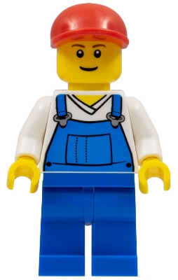 Overalls Blue over V-Neck Shirt, Blue Legs, Red Short Bill Cap