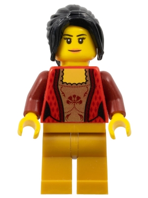 Female Corset with Gold Panel Front and Lace Up Back Pattern, Pearl Gold Legs, Black Hair Ponytail Long with Side Bangs
