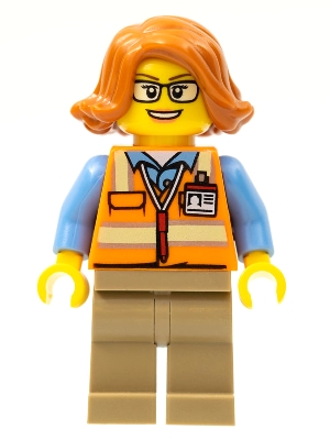 Cargo Office Worker - Orange Safety Vest with Reflective Stripes, Dark Tan Legs, Dark Orange Female Hair Short Swept Sideways, Glasses