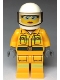 Fire - Reflective Stripes, Bright Light Orange Suit, White Helmet, Safety Glasses, Dark Orange Lips Closed Mouth Smile