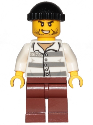 Police - Jail Prisoner 86753 Prison Stripes, Black Knit Cap, Reddish Brown Legs, Beard Stubble and Lopsided Grin