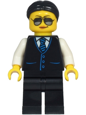 Limousine Driver - Female, Black Vest with Blue Striped Tie, Black Legs, Black Hair, Sunglasses and Medium Nougat Lips
