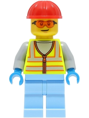Space Engineer - Male, Neon Yellow Safety Vest with Reflective Stripes, Bright Light Blue Legs, Red Construction Helmet, Safety Glasses