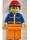 Construction Worker - Female, Blue Jacket with Diagonal Lower Pockets and Orange Stripes, Orange Legs, Red Construction Helmet with Dark Brown Ponytail Hair, Goggles