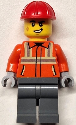 Construction Worker - Male, Reddish Orange Safety Jacket with Reflective Stripes, Dark Bluish Gray Legs, Red Construction Helmet, Lopsided Smile