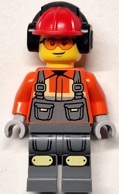 Construction Worker - Male, Dark Bluish Gray Overalls over Reddish Orange Safety Jacket with Reflective Stripes, Dark Bluish Gray Legs with Knee Pads, Red Construction Helmet with Black Ear Protectors / Headphones, Safety Glasses