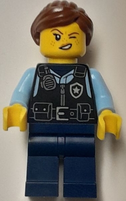 Police - City Officer Female, Black Safety Vest with Silver Star Badge Logo, Dark Blue Legs, Reddish Brown Hair with Ponytail