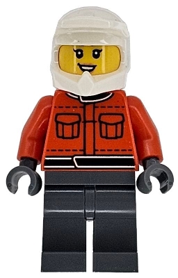 Formula 1 Pit Crew Member - Female, Reddish Orange Racing Suit with Pockets, Dark Bluish Gray Legs, White Dirt Bike Helmet
