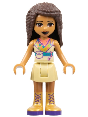Friends Andrea - Tan Skirt, Coral, Lime and Medium Azure Top, Gold Boots