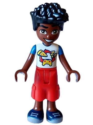 Friends Zac - White and Blue Shirt with Pizza and Game Controller, Red Cropped Trousers, Dark Blue Shoes