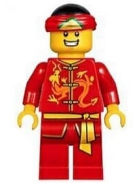 Dragon Dance Performer, Tied Red Bandana, Open Mouth Smile with Teeth