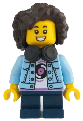 Child - Girl, Bright Light Blue Denim Jacket over Shirt with Record, Dark Blue Short Legs, Dark Brown Short Hair with Curls and Corn Rows, Black Headphones