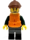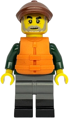 Fisher - Dark Green Open Jacket, Dark Bluish Gray Legs with Black Boots, Reddish Brown Flat Cap, Orange Life Jacket
