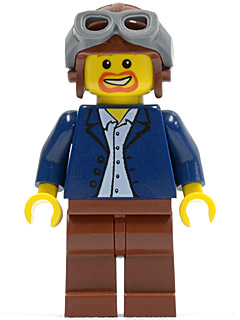 Dark Blue Jacket, Light Blue Shirt, Reddish Brown Legs, Aviator Cap and Goggles