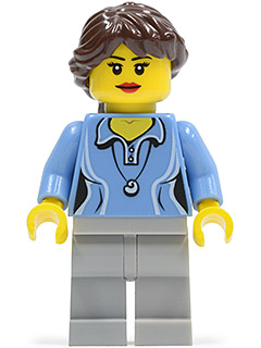 Medium Blue Female Shirt with Two Buttons and Shell Pendant, Light Bluish Gray Legs, Dark Brown Ponytail Long French Braided